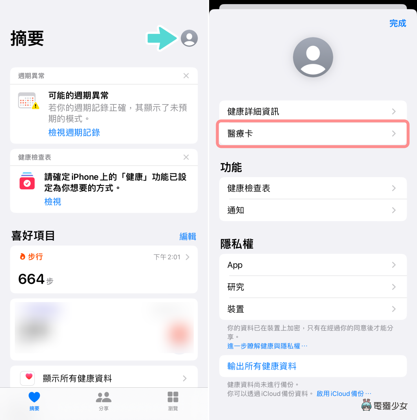 打开「健康」App 并在底部点选「摘要」,按下右上角的大头贴 >> 点选「医疗卡」