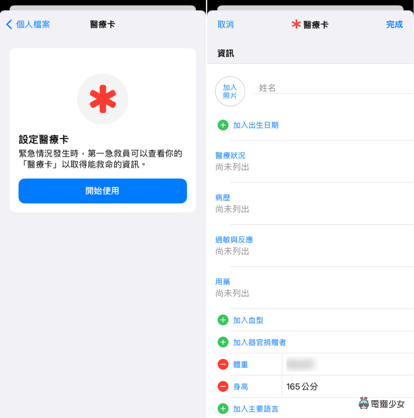 接下来就会看到「设定医疗卡」的选项,按下「开始使用」後,便可直接在此填写:出生日期、医疗状况、病例、过敏与反应、用药、血型、体重、身高、主要语言等基本资讯