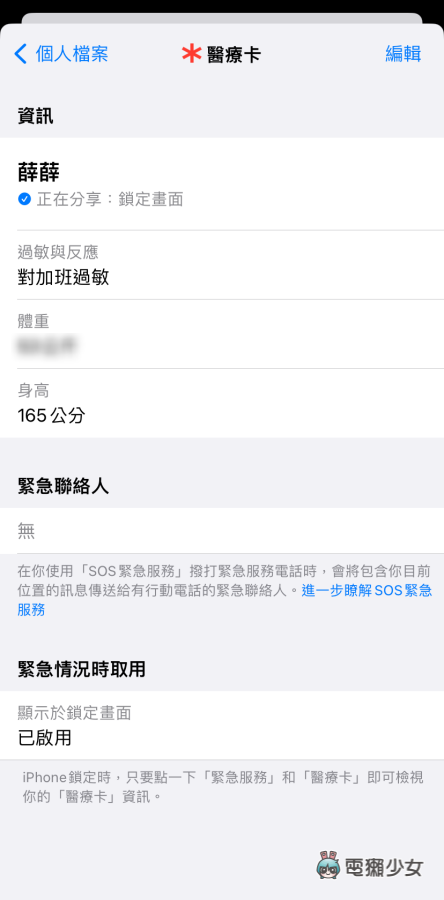 右滑「医疗卡」後,就能一目了然看到自己填写的详细资讯了,像是有无对药物过敏、紧急联络人、身高体重等等的资料