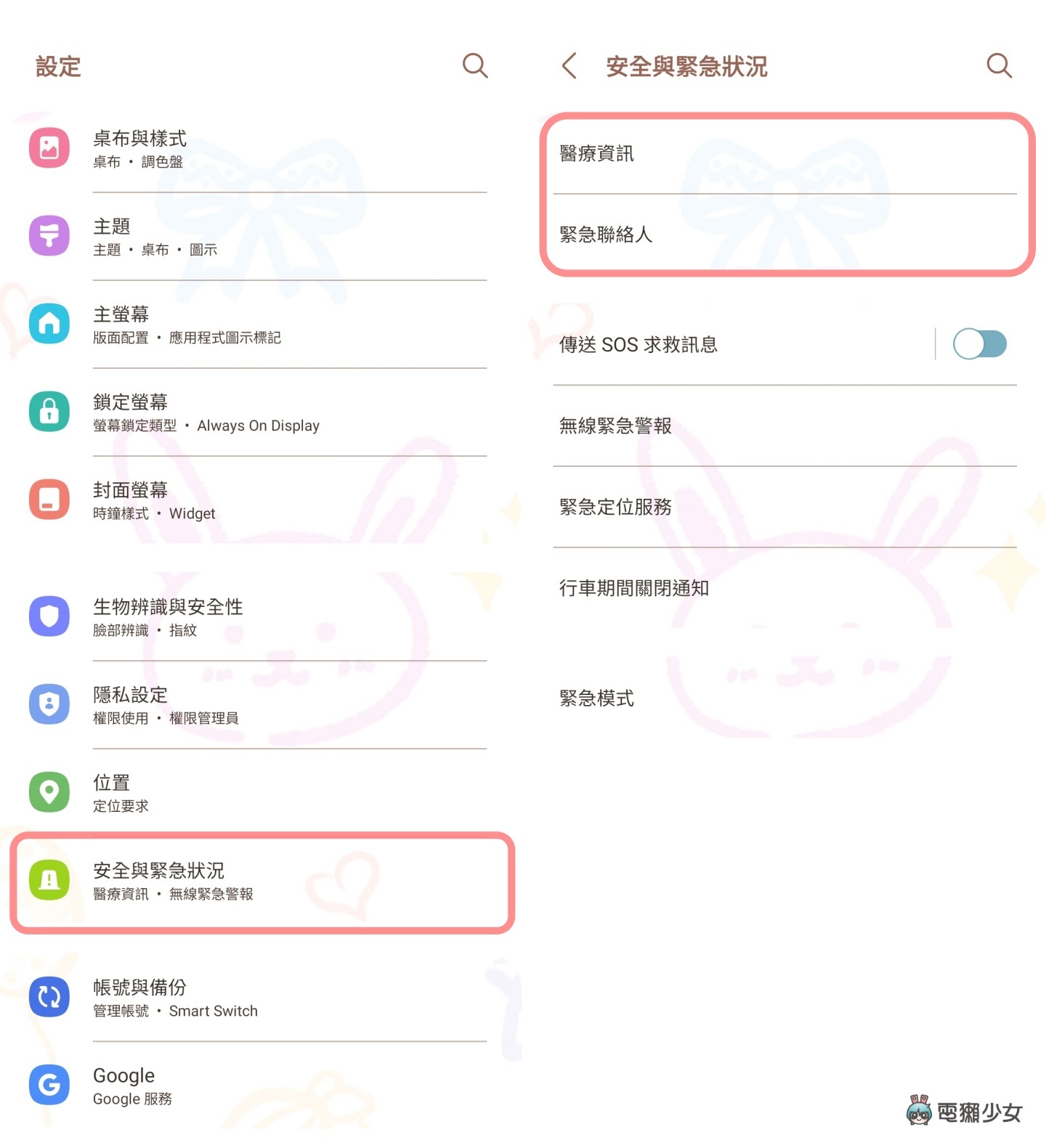 Android 系统一样能让你在手机上设定医疗卡。各大品牌的步骤大同小异,以下用三星的介面示范给大家看。路径为:进到手机中的「设定」>> 选择「安全与紧急状况」,就能填写「医疗资讯」和紧急联络人了
