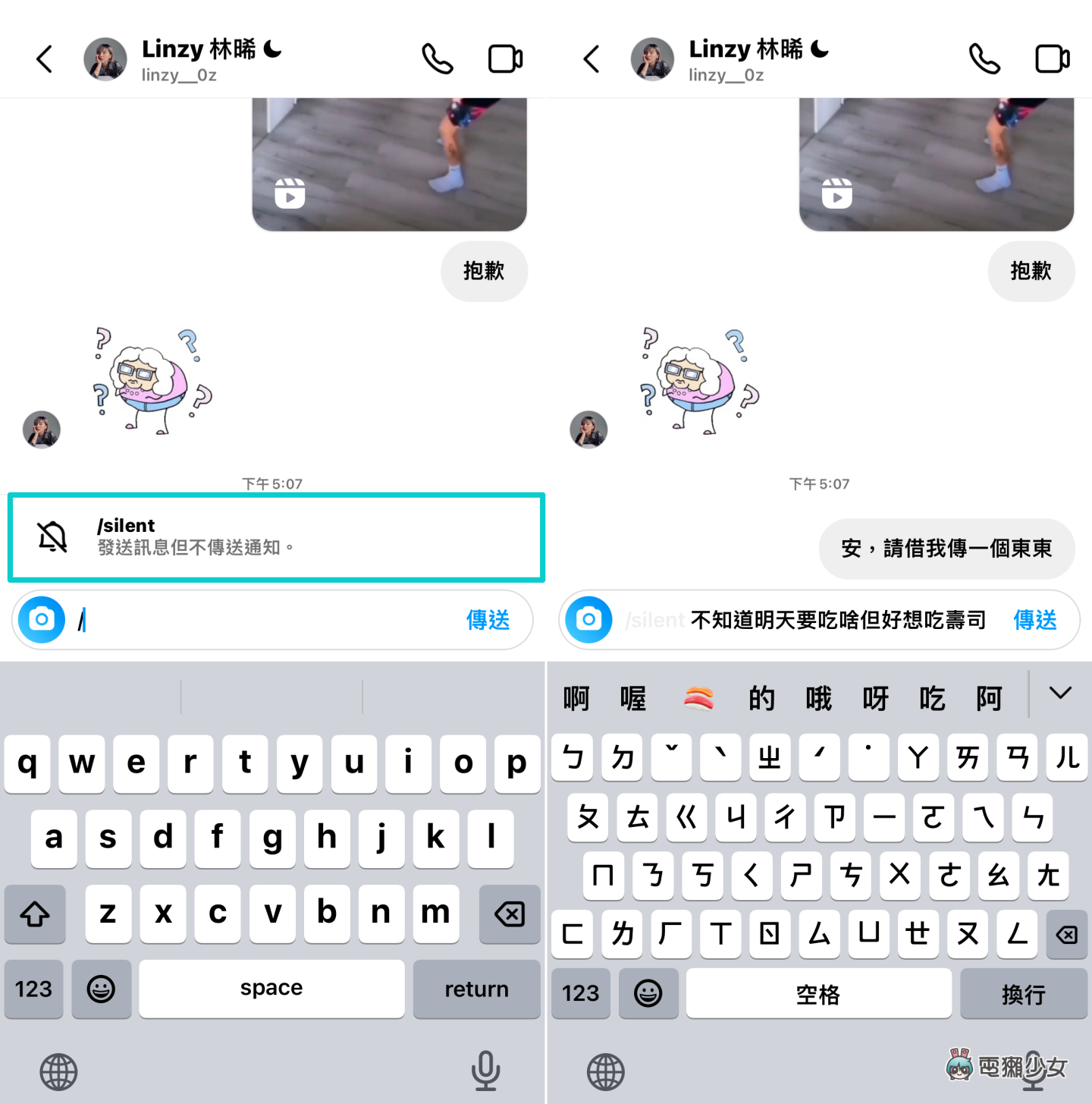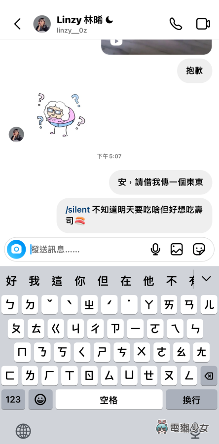 点进 Instagram 讯息後,如果想传讯息但又不想打扰到别人的话,只要先打上 / 就会看到系统跳出「/silent」的选项,能让你在不传送通知的情况下发送讯息