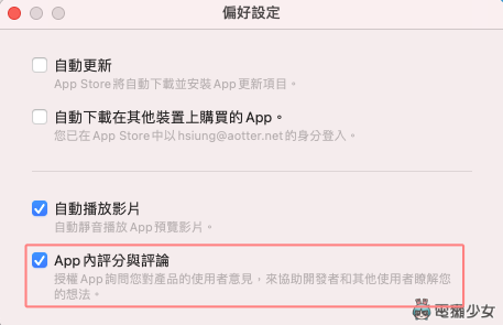 如果是 Mac 笔电的话,先打开 App Store,并在左上角的地方选择「App Store」>>「偏好设定」>>取消「App 内评分与评论」就可以罗