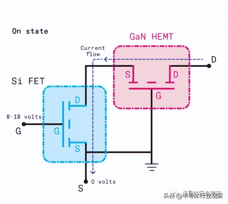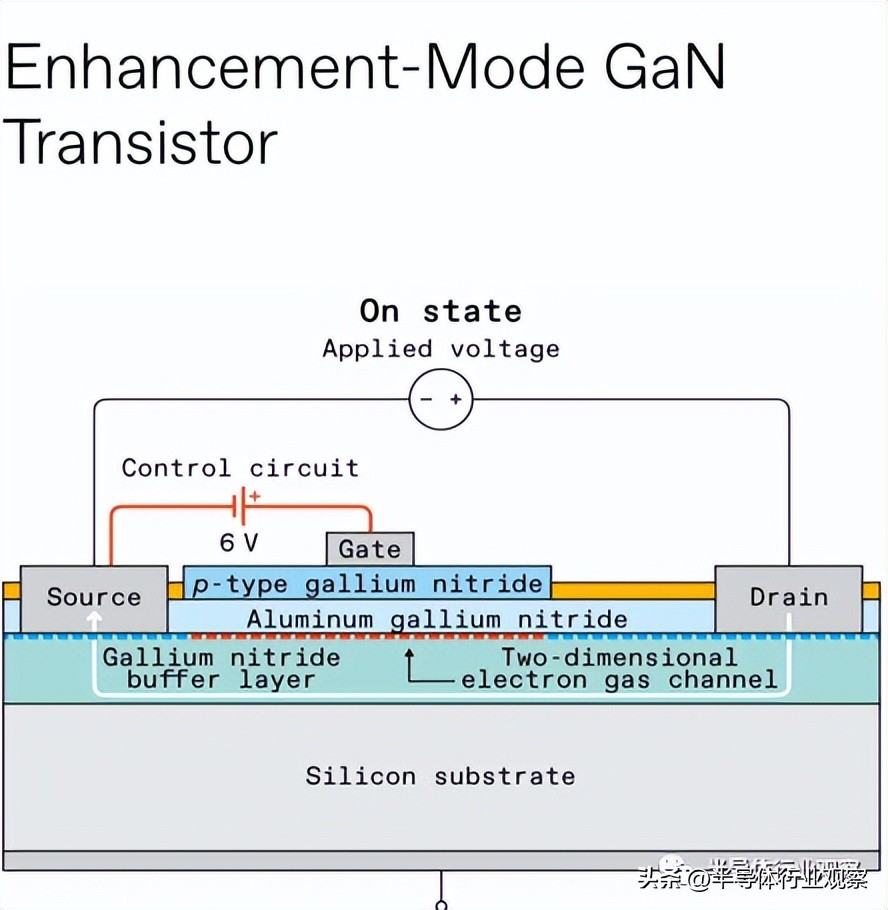 两种主要类型的氮化镓晶体管之一称为增强型器件。它使用一个工作在6伏左右的栅极控制电路来控制主开关电路,当控制电路关闭时,它可以阻断600伏或更高的电压。当器件开启时(当栅极施加6V电压时),电子在称为二维电子气的平坦区域中从漏极流向源极。在这个区域,电子极易移动——这是一个有助於实现非常高开关速度的因素——并且被限制在氮化铝镓屏障之下。当设备关闭时,栅极下方的区域会耗尽电子,从而断开栅极下方的电路并停止电流流动。